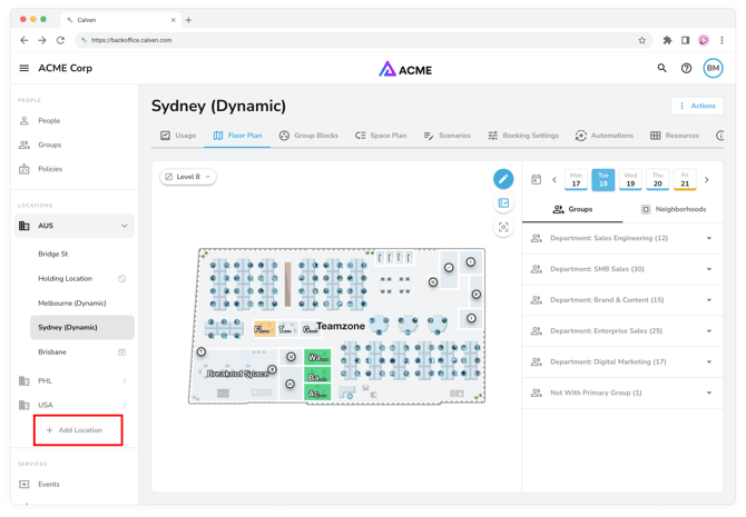 Before you can start booking, space planning, or capturing analytics, you'll need to set up your office(s) in Calven Backoffice. To create a new office, use the add location button in the locations section of the sidebar: