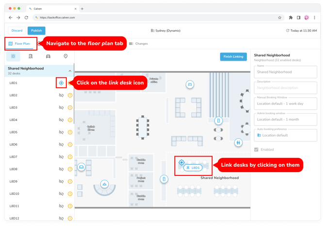 To do so, navigate back to the floor plan tab and click on a desk in the sidebar to begin linking. After you link the a desk, Calven will automatically select the next desk, allowing you to link multiple desks in quick succession: