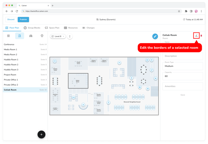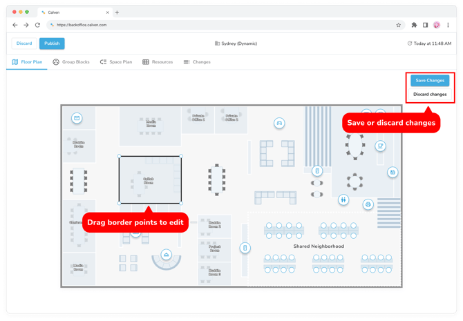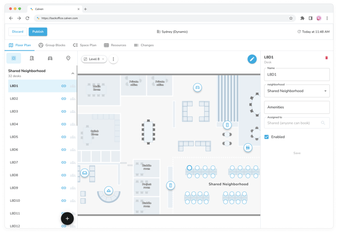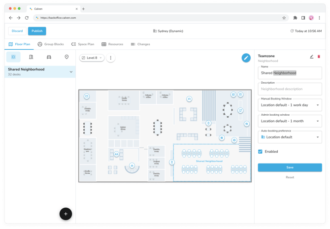 You can click on a neighborhood in the sidebar of the floor plan tab to edit it's name, description and more. One of the key features of the Calven neighborhoods is the ability to set custom booking windows: