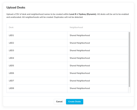 Note: bulk upload is only possible when a level is empty. If you've already added a neighborhood or desks, you will not be able to overwrite existing desks or add more via CSV upload