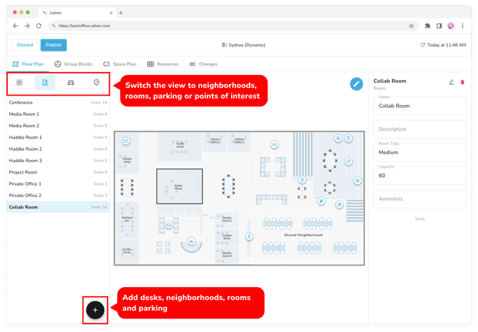 Rooms, points of interest, and parking zones are other resource types configured via the floor plan. Use the tabs at the top of the sidebar to choose which resource type you're viewing. You can add new resources via the add button at the bottom of the left sidebar.