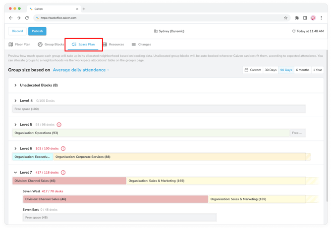 You can also use the space plan tab to toggle between different attendance metrics, and preview how much space your groups will take up in each neighborhood and on each floor: