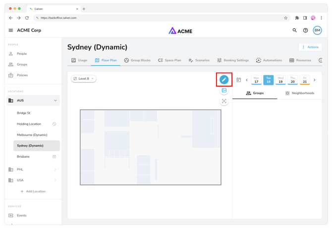 After you've saved your floor plan, you can always make changes at any time. For quick changes like assigning a user to a desk or changing a group's allocated neighborhood, you can use the edit button on the floor plan tab: