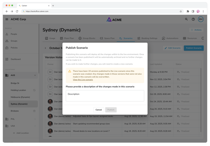 If you're about to publish a scenario that was created from an outdated version of the live scenario, Calven will give you a warning: