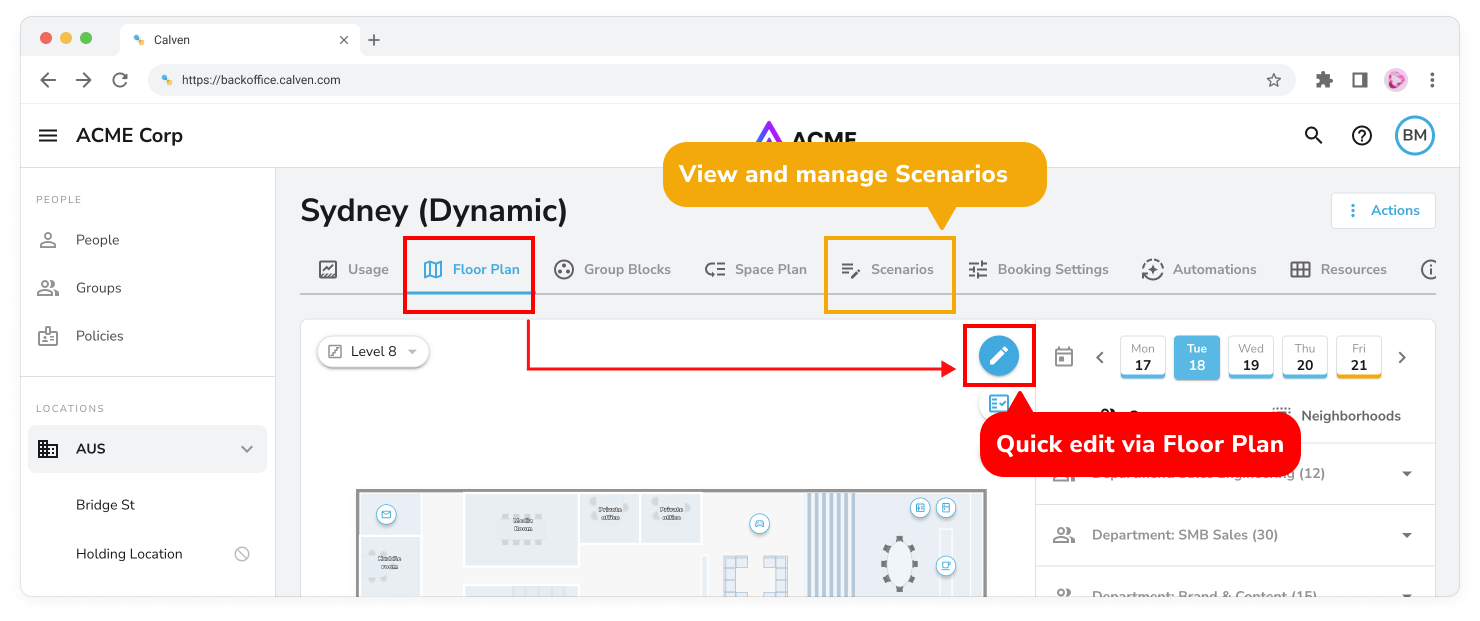 For making larger edits or scheduling changes over time, we recommend using scenario planning instead of regular edits. Note the differentiation between quick edit via Floor Plan and Scenarios:
