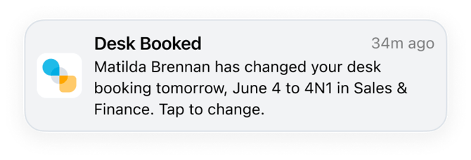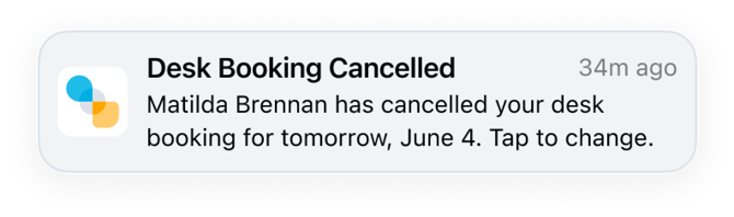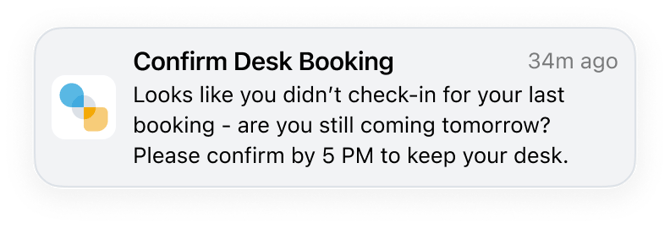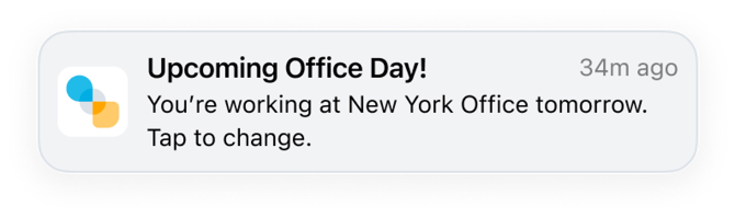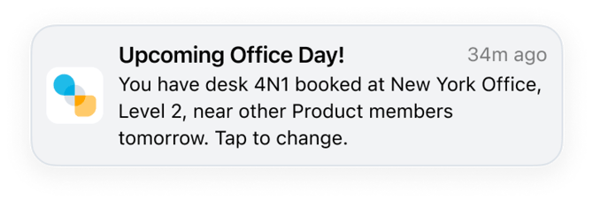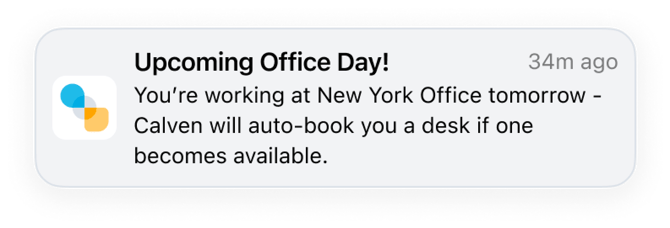 Calven will notify you on the day before you're planning to be in the office. Sent at the time configured by your office administrator. You'll receive a different version of this notification depending on whether you've got a desk booked, are on the waitlist, or are planning to attend the office without a desk booking. |