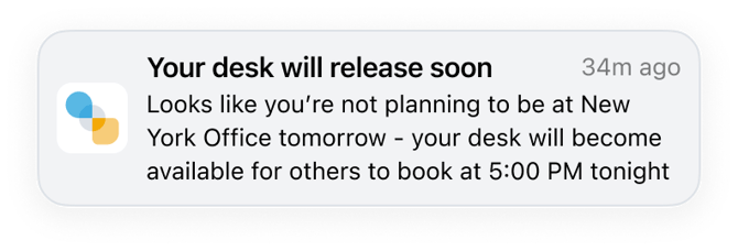 Calven will notify you the night before your assigned desk is set to be auto-released for others to book. This will only happen if auto-release assigned desks is enabled for your office. |