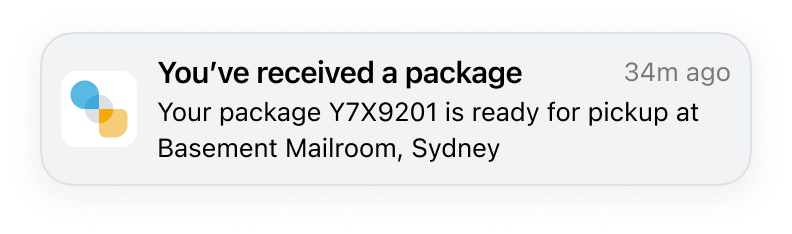 Sent when a package is logged for you in mailroom. Calven will notify you when your package is initially logged - then you'll receive a reminder once per week (either on Monday if fully remote, or the first in-office day each week), until the package is marked as picked up.