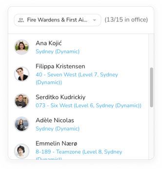 The group view widget gives a view on which members of a group are planning on attending the office that day. This allows administrators to have high visibility over particular groups - e.g. fire wardens, first aiders, or VIPs.