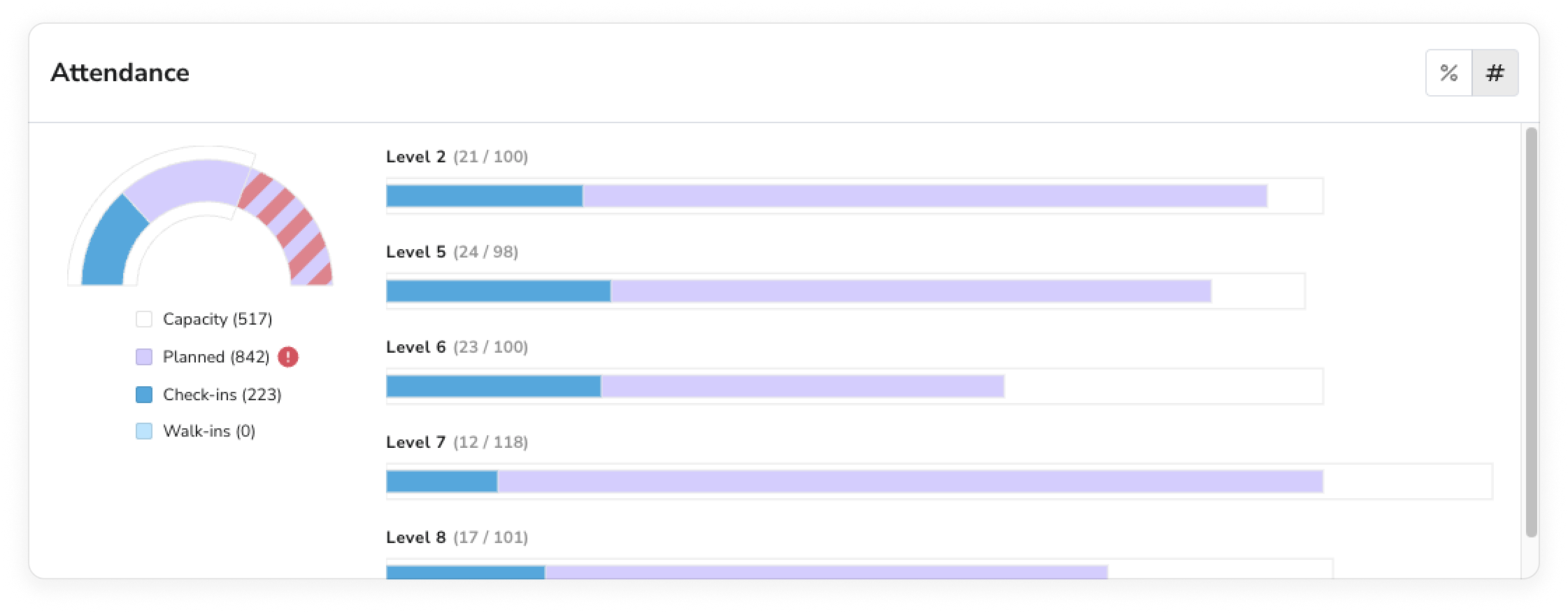 For each floor, 3 metrics are shown for desk/floor bookings. These metrics can be shown as % of capacity, or as a # count.