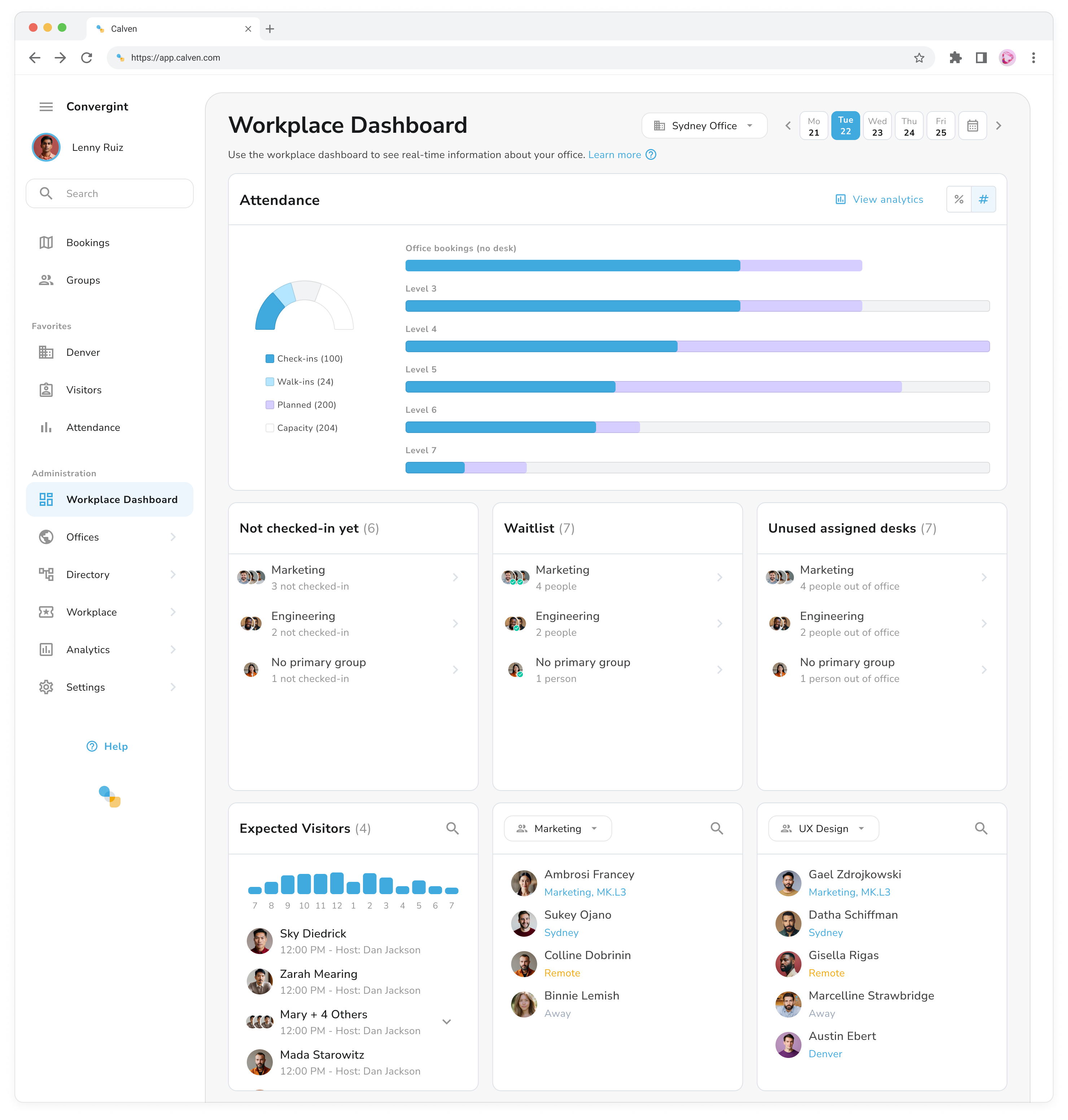 The Calven Workplace Dashboard gives administrators the ability to see real-time information about their office